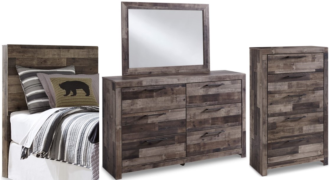 Includes twin panel headboard, 6-drawer dresser with mirror and 5-drawer chest
