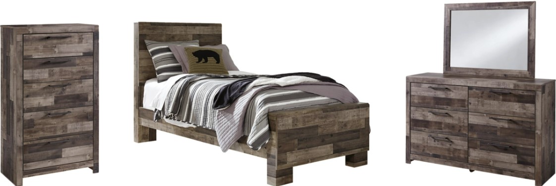 Includes panel bed (headboard, footboard and rails), 6-drawer dresser with mirror, and 5-drawer chest