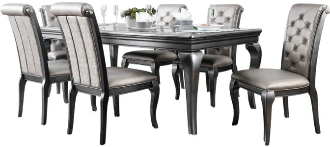 This dining collection will be the focal point of any home with its eye-catching gray finish and elegant structure. Double glass inserts draw attention to the Moroccan-inspired inset patterns while a convenient 18-inch leaf offers the option of hosting a large or intimate dinner. The padded faux leather upholstery comes adorned with crystal-like acrylic buttons while the side chairs are additionally emphasized by their sophisticated scrolled backs.This dining set is the perfect statement addition to any dining area.