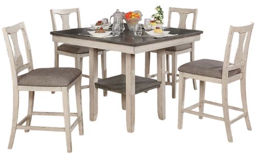 Country style goes perfectly with feeding a big gathering of friends and family. This seven piece set includes a large dining table and six chairs, giving you the perfect solution to your dining room. The soothing toned down antique white wood and gray fabric color combination gives you a relaxed place to enjoy your meals and chats.Read More