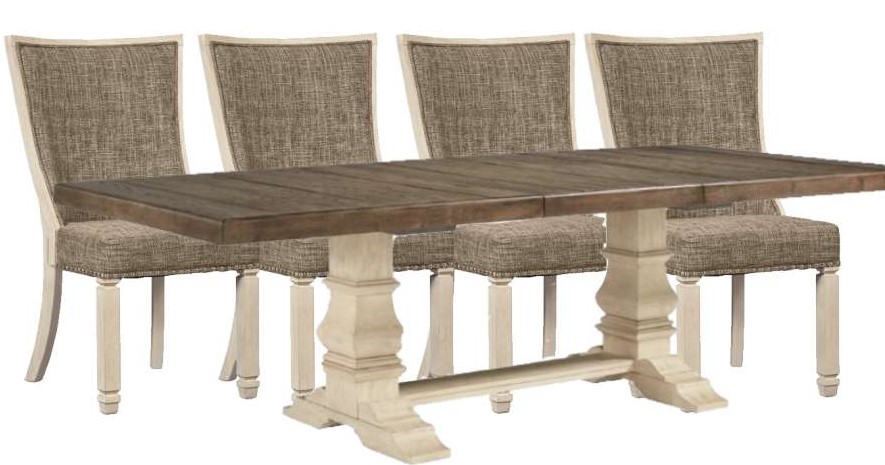 Whether your style is farmhouse fresh, shabby chic or country cottage, you'll find the Bolanburg extension dining table works on so many levels. The table's two-tone finish, with weathered gray on the tabletop and textured antiqued white on the double-pedestal base, offers twice the character and twice the appeal.
