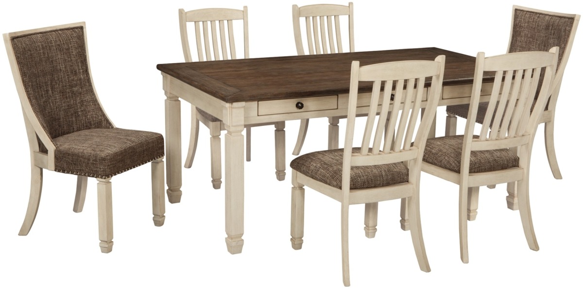 Enjoy beautiful cottage style in this classic farmhouse dining table set. With a rustic planked top and six convenient drawers, this table serves up casual with a vintage twist. The gently distressed tabletop, rake-back and upholstered dining chairs create the perfect spot for an impromptu gathering.Read More